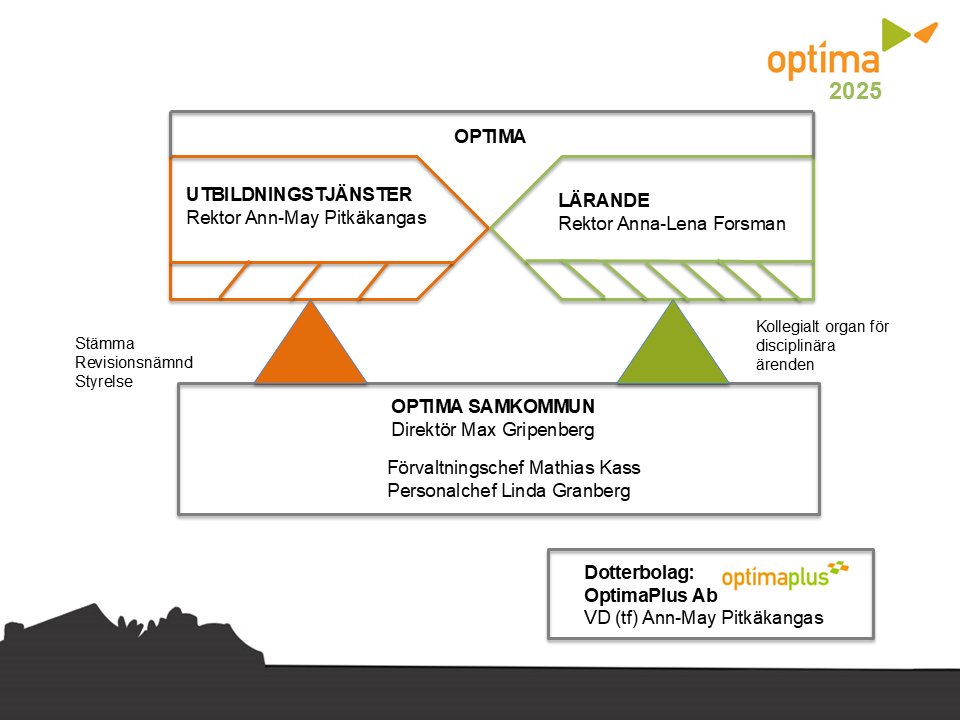 Optima leds av samkommunens direktör Max Gripenberg och delas in i resultatområdena Lärande, Utbildningstjänster och Förvaltning.